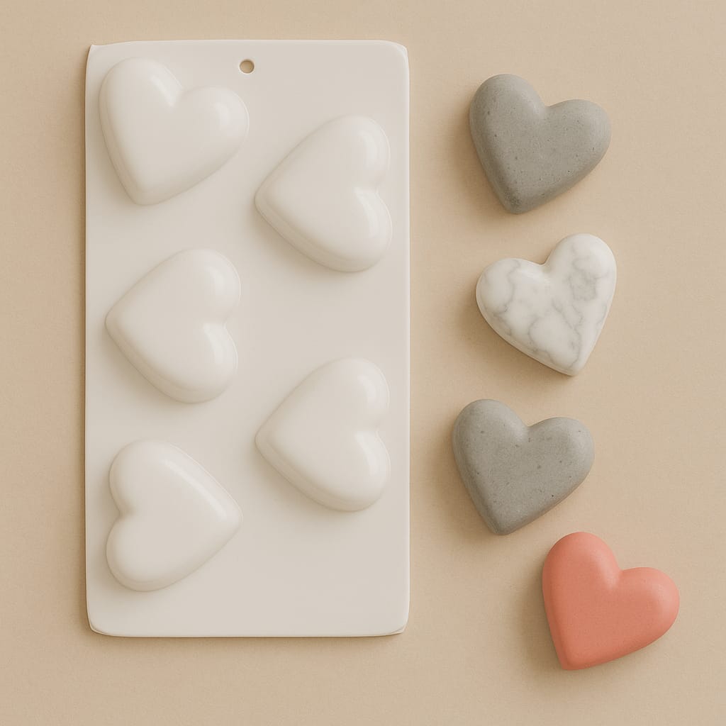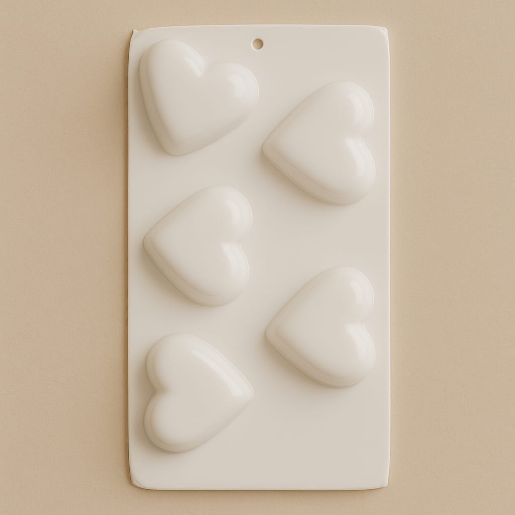 Molde termoformado de alta calidad con cinco corazones. Perfecto para crear piezas decorativas o artesanales en cemento, yeso, resina acrílica, jabón y aromatizantes. Reutilizable, fácil de limpiar y desmoldar. Se recomienda el uso de desmoldante en cada colada para prolongar la vida útil del molde y facilitar la extracción de las piezas.